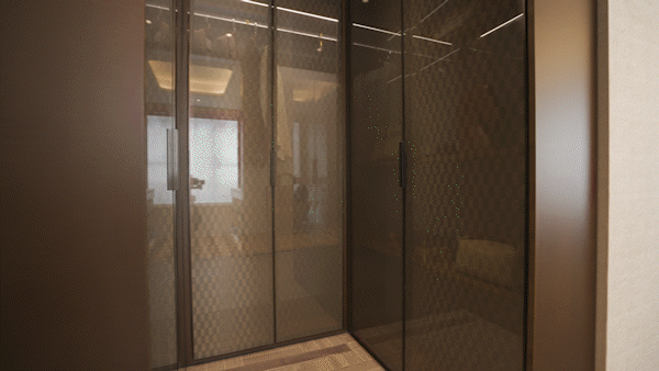 背景墙的艺术壁布、衣帽间的夹丝玻璃门、地面的回型拼花,处处是低调又高调的质感