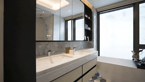 墙面冰岛晶玉石材,仿佛冰川融入深海,波光粼粼,镜柜内置有美妆冰箱,搭配电动除雾功能,于最细微处,呵护业主的生活品质