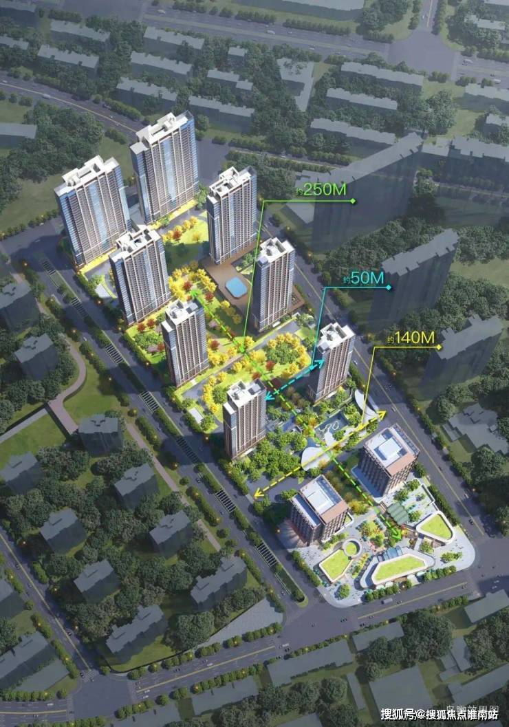 更关键的是主景观轴——纵向约250m、横向约140m,楼间距约50–57m,这在市区紧凑地块里极为少见.