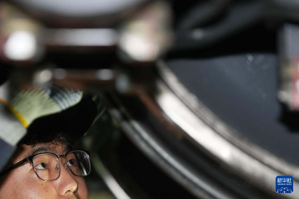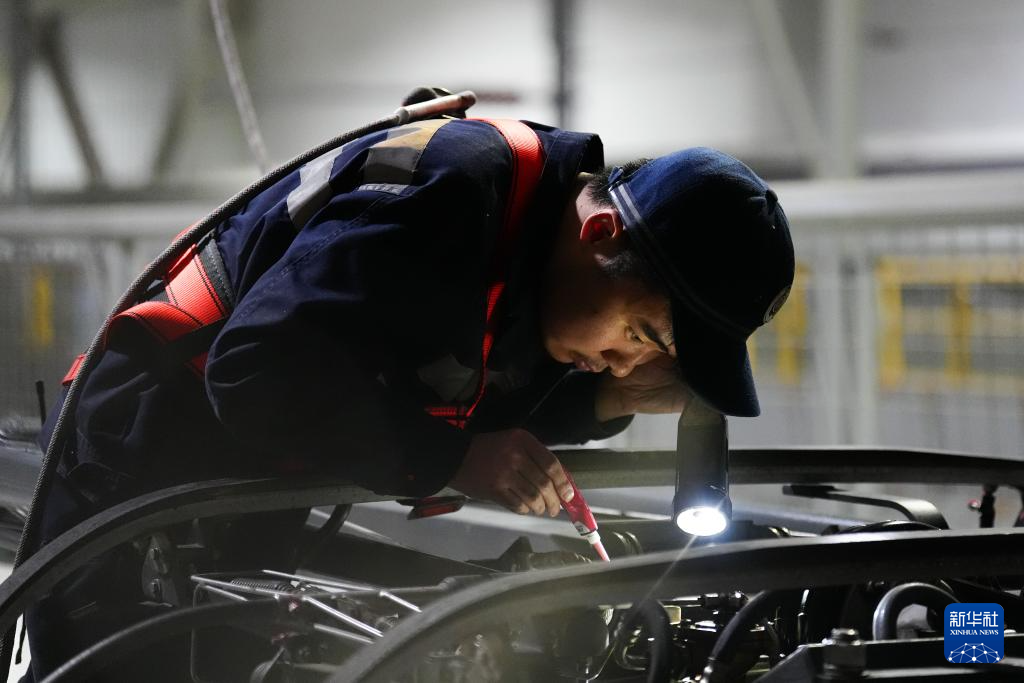 1月27日,中国铁路青藏集团有限公司西宁车辆段动车运用车间工作人员程俊刚在检查受电弓。