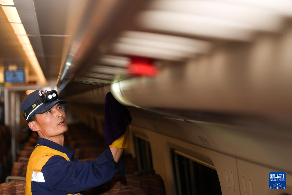 1月27日,中国铁路青藏集团有限公司西宁车辆段动车运用车间一体化单位工作人员程辉祖在清洁行李架。