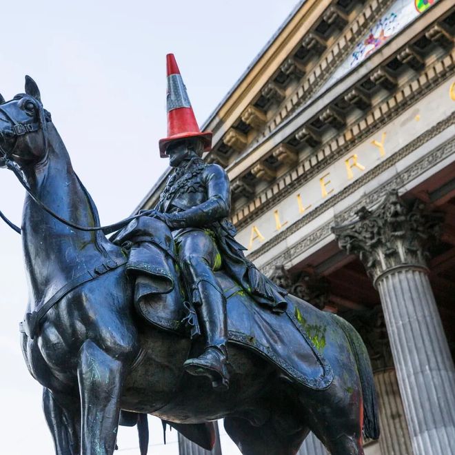 不过比美术馆本身更有故事的,要数门口的威灵顿公爵雕像了。公爵名字叫做阿瑟·韦尔斯利,是英国的第21位首相,曾在滑铁卢战役当中打败拿破仑,也是BBC评选出的最伟大的100个英国人之一。公爵雕像常年头上带着一顶锥形路标的“帽子”。据说最早有人恶作剧,深夜爬上雕像给公爵带了帽子,市政厅三番五次的把“帽子”摘下来, 但是帽子总是“莫名其妙”的再放回到公爵雕像上,后来就被保留下来了。现在的雕像反而成了人们在格拉斯哥必看的一景,也是当地人幽默感的最好体现。