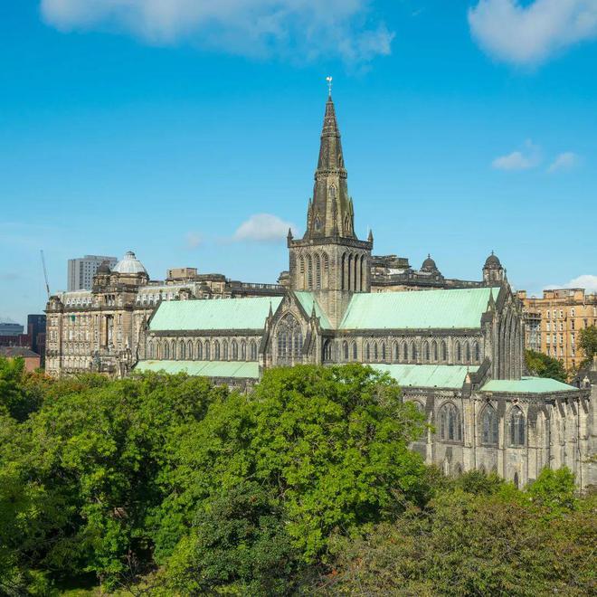 格拉斯哥大教堂,据说是为了献给格拉斯哥的守护圣人,也即格拉斯哥第一位主教圣芒戈而建造。作为苏格兰最宏伟的中世纪建筑之一,格拉斯哥大教堂是苏格兰唯一一座在1560年宗教改革中完好无损地幸存下来的大教堂。哥特风格的建筑设计,镶嵌着高大的玻璃花窗,看起来也颇为雄伟壮观,让人忍不住回想中世纪的古老时光。