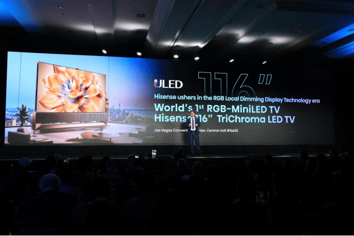 另外,海信还发布了全球首台也是全球最大的116英寸RGB-Mini LED电视,通过RGB三维控色液晶显示技术的加持,也让用户得以更为直观地感受画质的提升。