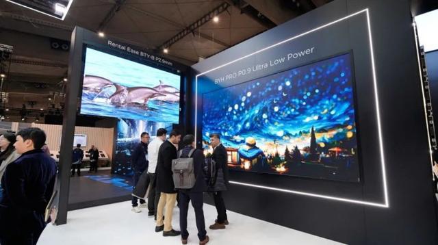 展区现场,京东方重磅展示了MLED领域创新技术成果。京东方首发主推直显新品BYH-COB系列,采用大板模组设计,单模组尺寸达14.5英寸,有效减少拼缝数量,提升画面整体性,广泛应用于会议室、商超、展厅等场景。