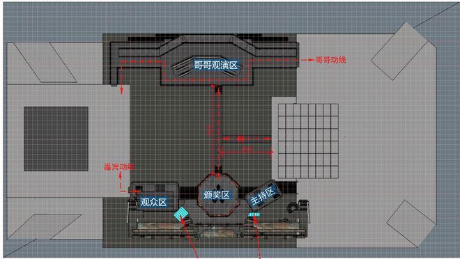 在保留之前竞演的A、B舞台的基础上,在整场活动的流程中使用哥哥区和颁奖区作为串场节目小舞台,丰富了整个演出空间。