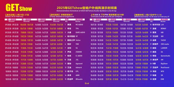 为让广大听众能更好地安排时间前往鉴赏,不错过GETshow展同期举办的各项丰富活动,户外线阵巡演展示演出时间表双手奉上!