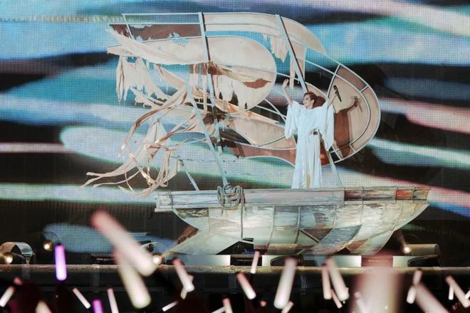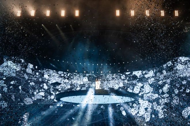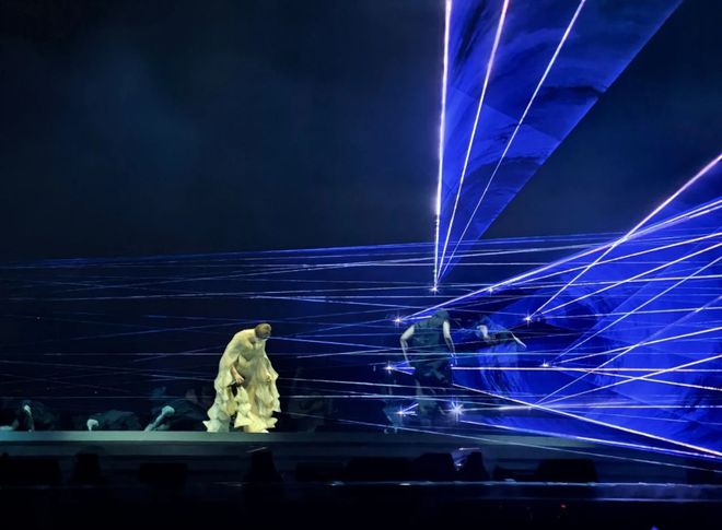 在《倾斜》一曲中,三个平台同步以不同转速旋转,配合LED墙面投影的波浪纹路,营造出“坠入时空漩涡”的视觉奇观。