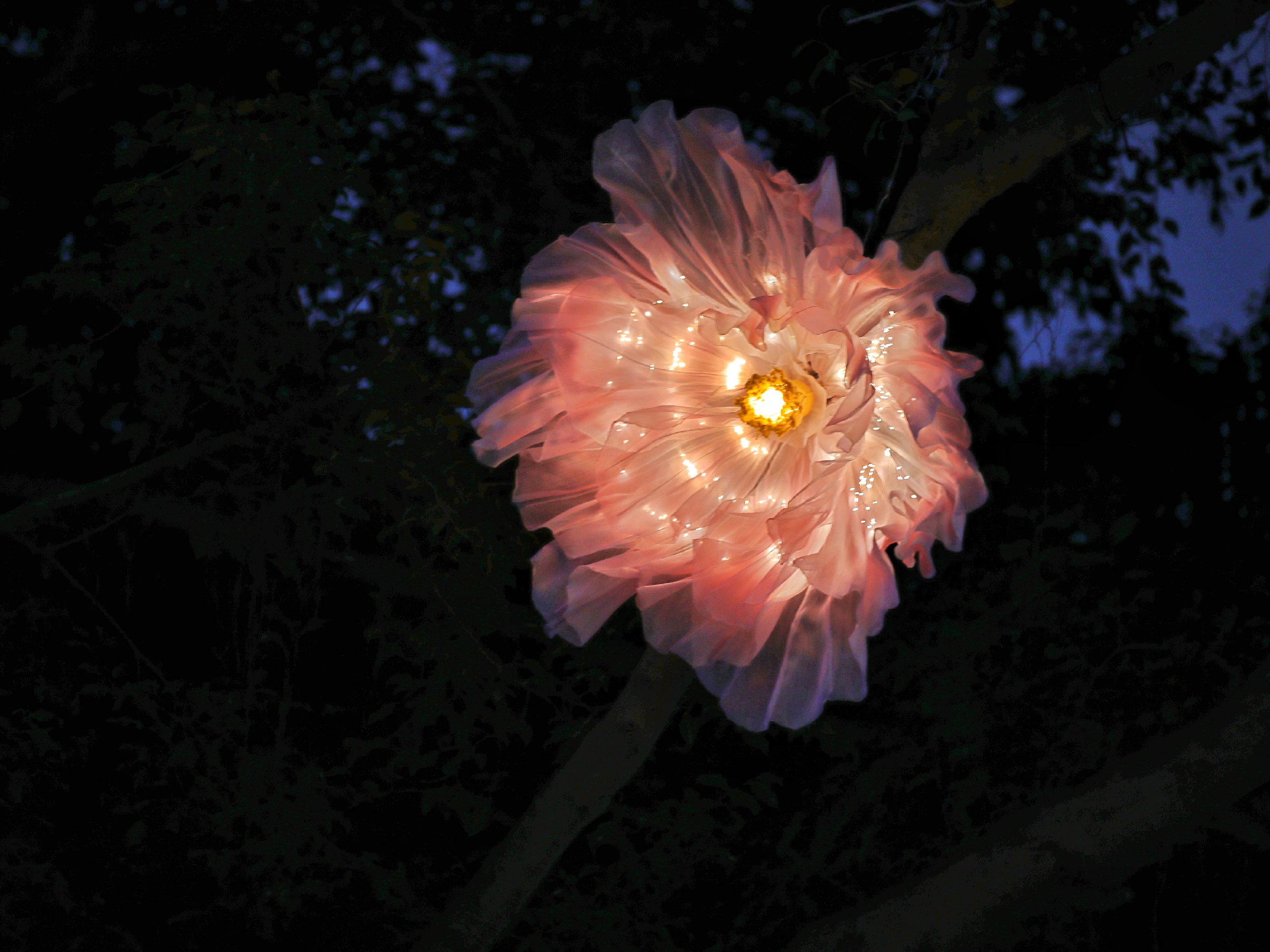 夜幕降临,华灯初上,在南俊路璀璨的“星空”中,28个蝴蝶灯随着点点星光闪烁翩翩起舞,9朵玫瑰灯在光影变换中一开一合,花瓣薄如蝉翼,浪漫灵动,在呼吸灯动态效果下,灯光由明到暗,再由暗到明,营造出梦幻唯美的氛围。