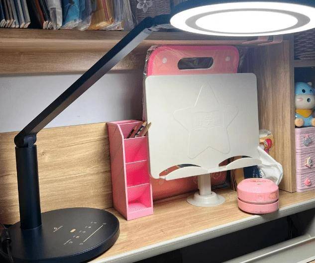该台灯巧妙地运用了面+环双光源设计,将面光源与环光源完美结合,实现了更广泛的光线mm,出光面积宽广,有效减少了暗角,确保即使在书本堆积的桌面上也能清晰照明。