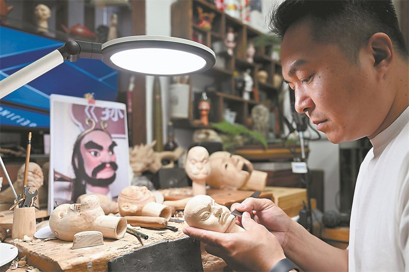 “漳州木偶头雕刻”市级传承人林城盟在为《三打白骨精》重新制作木偶。施辰静 摄
