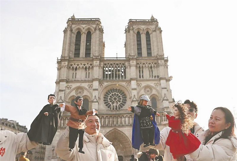 去年底,漳州布袋木偶新剧《巴黎圣母院》在巴黎圣母院广场上演快闪。(受访者供图)