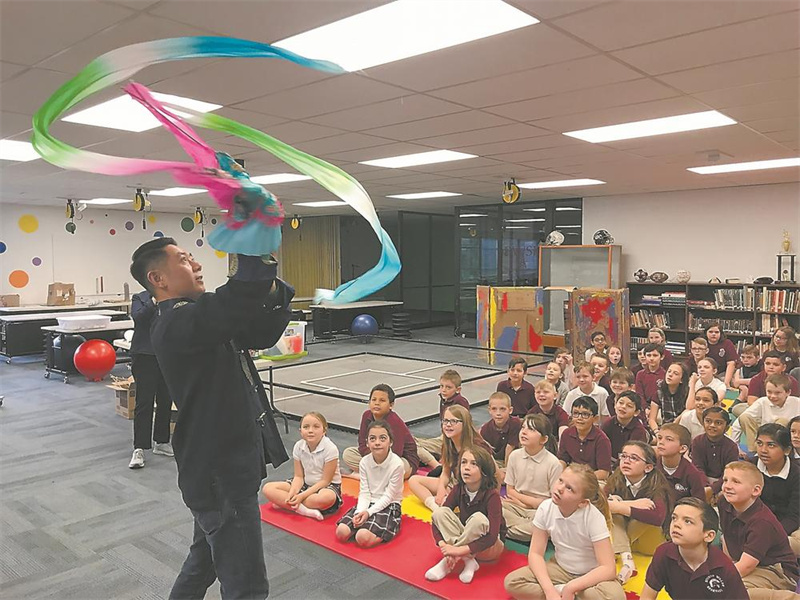 在美国校园,省级非遗代表性传承人陈黎晖的表演深深吸引了小朋友。(受访者供图)