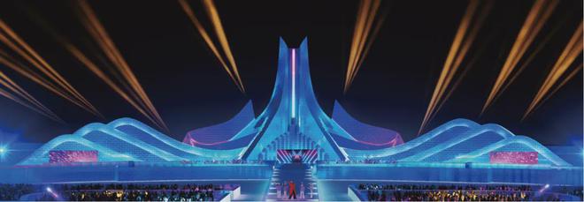 梦想大舞台在设计上独具匠心,以天鹅引颈高歌为灵感来源,巧妙借鉴了天鹅在鸣唱时引颈向上的优雅姿态。舞台中央高耸的冰柱与两侧波浪形结构相映成趣,宛如天鹅展翅翱翔,展现出无尽的动感与美感,同时也诠释了“绿水青山就是金山银山,冰天雪地也是金山银山”的设计理念,进一步提升了建筑的文化内涵与审美价值。