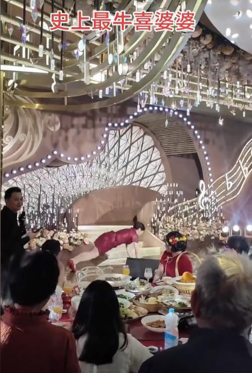 这场面太冲击了,头顶地,手撑地,两只脚直挺挺地朝天蹬着,动作溜得一批。周围宾客全看呆了,新娘看着婆婆表情复杂,有点无奈,但又不好说啥。