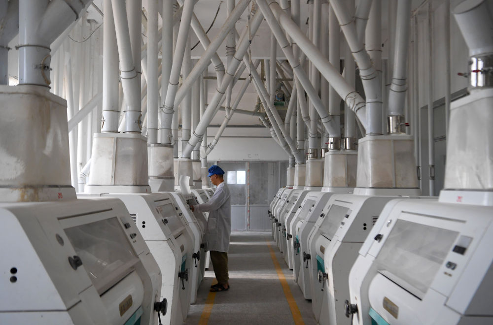 5月27日,在淮滨县海莲粮食加工有限责任公司,厂内设备轰鸣,正在加工弱筋小麦面粉。新华社记者 郝源 摄