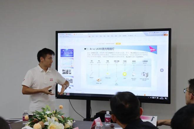随后,研发总监曾庆平向专家调研团详细介绍了公司在核心技术研发与重点产品上的突破,强调以激光光源与LED技术为核心,打造了Aria系列特色产品矩阵。其中,包括Aria LA300激光电脑灯、Aria LA500激光探照灯、Aria LA60FC全彩激光灯、Aria LE680BSWF ELD切割灯、Aria LE1400/1200 PROF LED切割灯等重点产品及相关技术特点。分享中,他还介绍了产品中使用模块化设计便于维修维护,热管导热技术与高导热铝基板提升散热效率,八路驱动技术减少损耗、提高光效转化,以及具备无极旋转功能的切割结构等技术亮点,同时提及产品在防水性能、抗紫外线老化等方面的优化,展现了企业在核心技术研发与产品性能提升上的系统性突破。