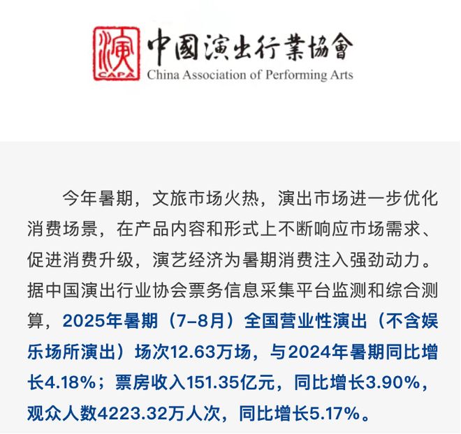 2025年国内舞台演出市场持续升温,据中国演出行业协会票务信息采集平台监测测算,仅2025年暑期(7-8月),全国营业性演出(不含娱乐场所演出)就达12.63万场,票房收入151.35亿元,吸引4223.32万人次观看,较2024年同期分别增长4.18%、3.90%和5.17%。