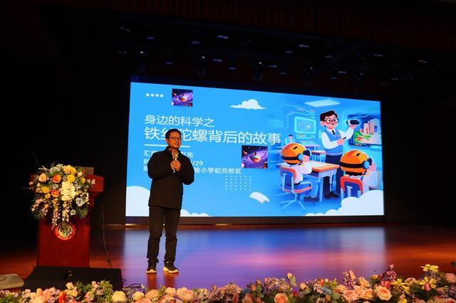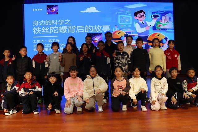 此次科技节,学校还有幸邀请到了学校科学副校长—来自郑州师范学院的陈卫光博士,为三四年级学生带来了一场别开生面的科普讲座。讲座围绕《身边的科学—铁丝陀螺背后的故事》这一主题,借助生动的动画演示、形象的图片讲解,将抽象的铁丝陀螺的制作原理变得直观易懂,让同学们轻松“看见”科学原理的奇妙之处。
