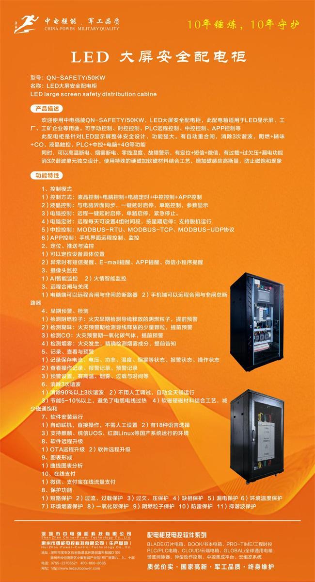 QN-SAFETY/50KW LED大屏安全配电柜则代表了行业安全技术的新高度。这款专为显示屏整体安全设计的产品,将智能控制与主动防护融为一体,支持从液晶触控到APP远程控制的全方位管理。其核心的谐波消除技术采用特殊的硬磁加软磁材料复合工艺,可有效消除90%以上的谐波干扰,防止磁饱和现象,同时带来5-10%的节能效益。