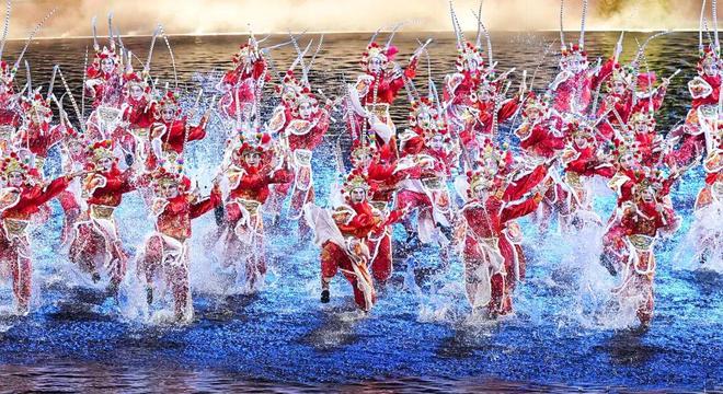 同样引爆全场的还有百头醒狮表演——醒狮踏着铿锵锣鼓在水舞台腾挪闪转,时而蹦高打滚,时而叠成小塔,老少表演者的默契配合让千年技艺焕发生机。