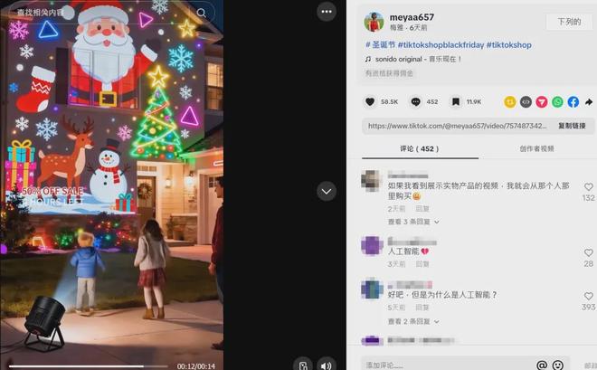 11月21日,该“AI博主”在TkTok上发布了一条AI视频,内容为展示LED圣诞投影灯的氛围效果。该视频利用AI数字工具,生成圣诞老人、雪人、雪花的灯光投影效果,在夜空下五彩斑斓地闪烁在房屋上以及室内天花板上,将普通的房屋立刻变成童话世界的模样,孩子们开心地手舞足蹈。浪漫温馨的画面瞬间吸引无数网友围观,并激发起他们的向往感。