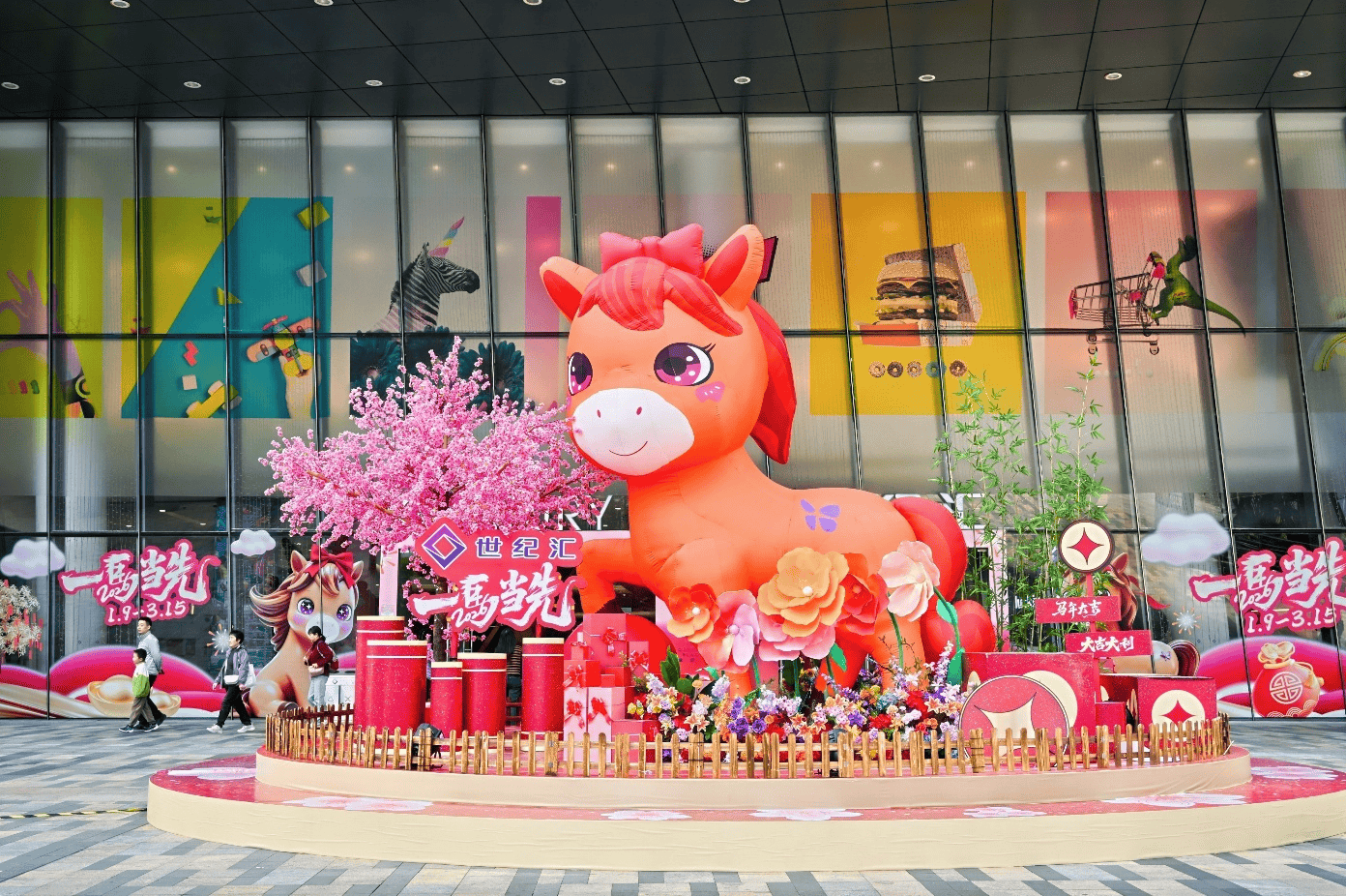 2026年1月9日至3月15日,深圳世纪汇「一马当先」与萌马 “焦糖・夏茉”打造热烈新年祈福体验场,以新春富贵竹搭配爆竹与铜钱演绎中式新年氛围,传递节节高升的美好祝福,寓意马年好事发生!“马到功成”萌马引路,红色富贵的马车穿梭在缤纷桃花中,寓意马踏新途皆得所愿;“幸福加马”新春幸运屋与红红火火的巨型中国结直接将年味拉满,在光影交织中传递热闹祥和的新年氛围;“马上发财”逾3米高的金色幸运树,邀请每一位来世纪汇的顾客诚心写下新年心愿高挂树枝,祈祷新年幸运安康,马上发财;“快马加鞭”4匹活泼灵动的 “焦糖·夏茉” 为新年福气加“马”,伴随新年的喜悦旋转每一圈都仿佛奔驰在幸福的道路上,祝福人们新一年跃马前行,福禄相伴!