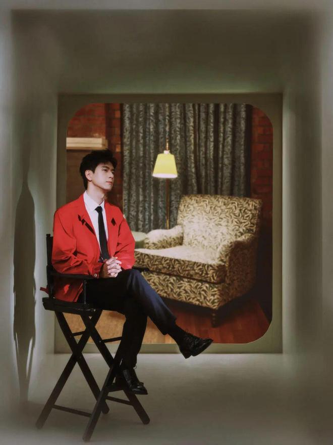 范丞丞身着Mr.Dandy定制正红西装,精纺羊毛面料垂坠感佳,戗驳领双排扣款式正式庄重。收腰剪裁凸显比例,领口红色细丝带点缀,少年气十足。