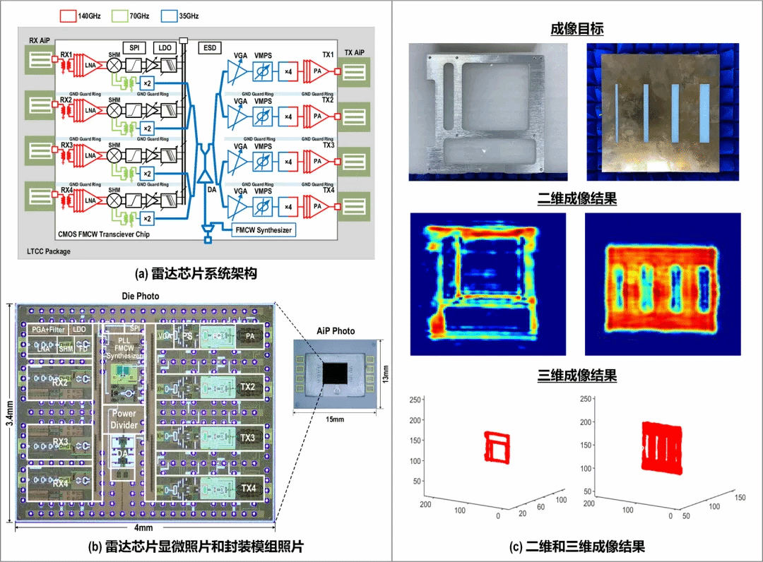天津大学微电子学院马凯学教授团队研究成果荣膺“2025年度半导体十大研究进展”。马凯学教授团队研发了国际首款支持4发4收D波段CMOS FMCW雷达收发机阵列芯片、集成封装阵列天线前端。在本振移相多通道功率合成大功率发射、高灵敏度接收、快速线性FMCW调频和背腔式高增益天线等四项关键技术上取得新进展。在无透镜辅助下实现28.7 dBm等效全向辐射功率,刷新了该频段单片CMOS雷达芯片功率纪录,距离分辨率1.3 cm,最大探测距离16.8 m,实现了雷达与成像演示。展现了硅基毫米波雷达在高精度探测与成像领域的应用潜力。